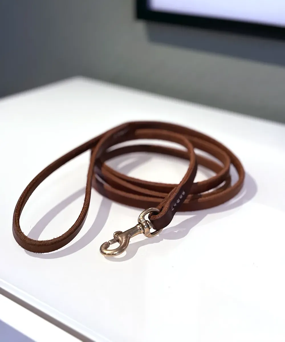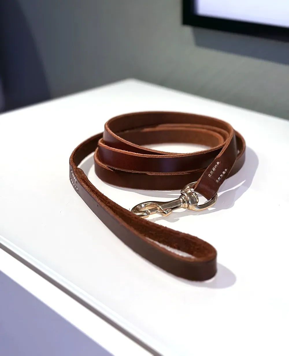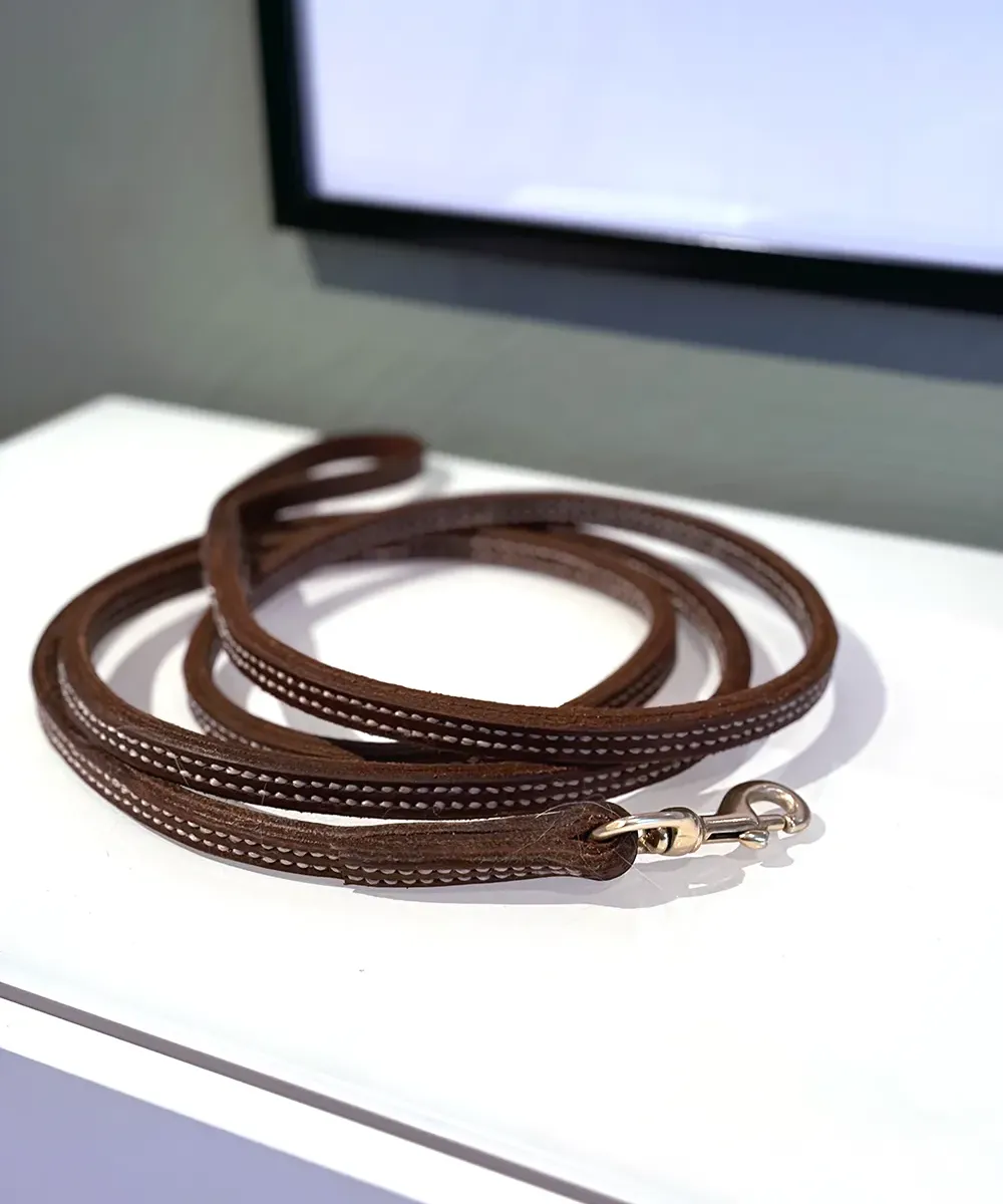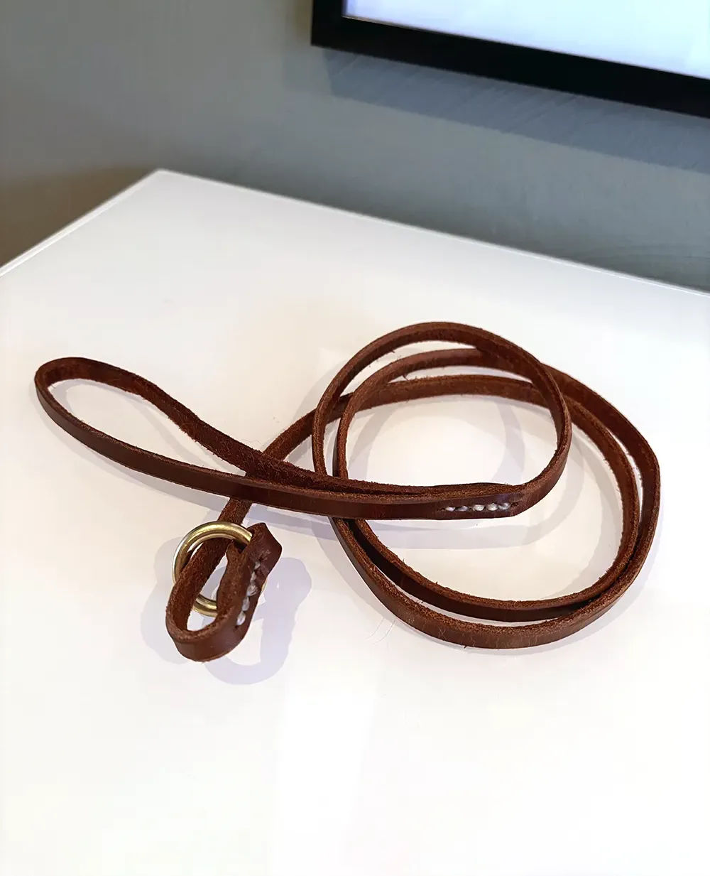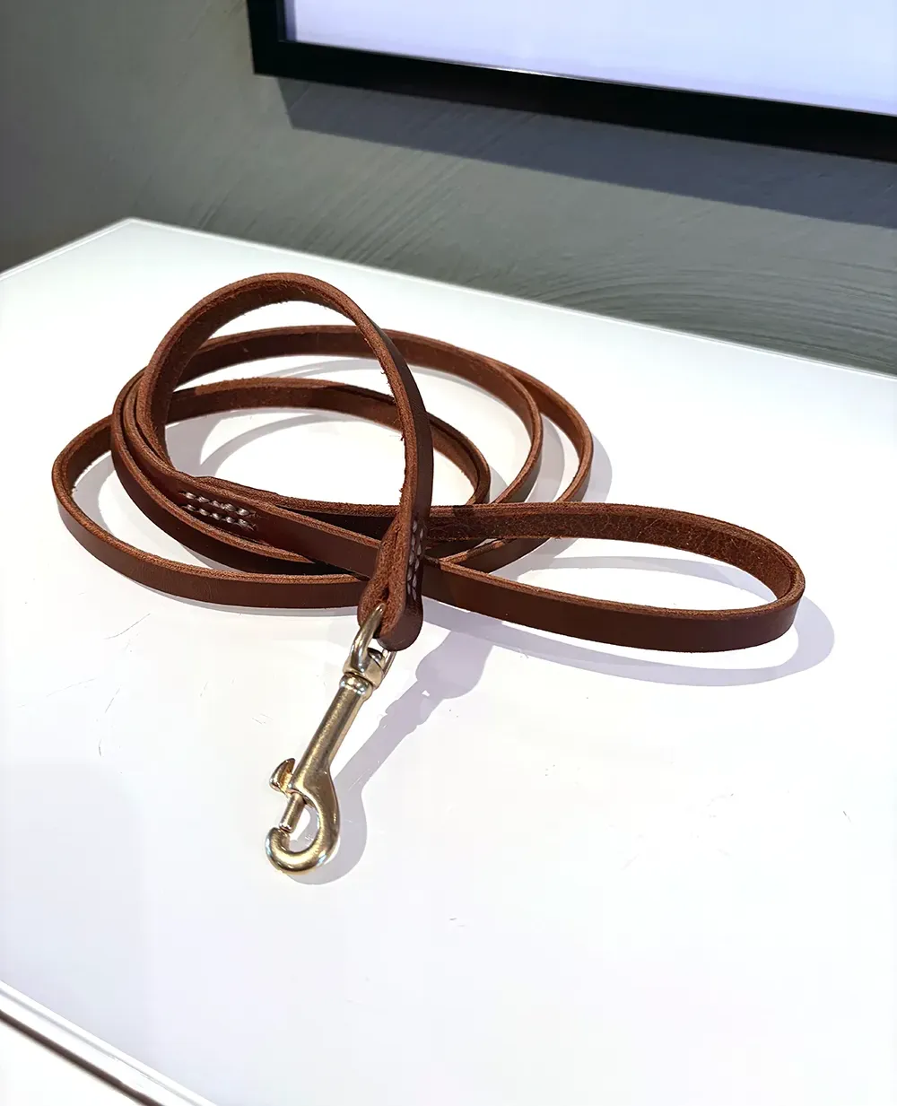 Handsytt läderkoppel i 10 mm bredd med karbinhake i gjuten mässing. Passar till de minsta hundarna.