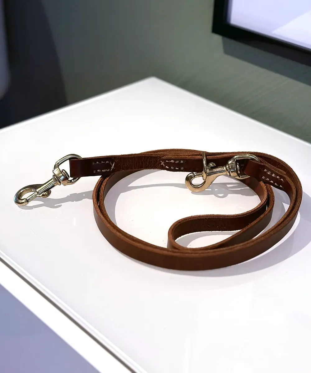 Kopplet avslutas med en kraftig karbinhake i gjuten mässing, som både tål tidens tand och ger ett elegant intryck.
