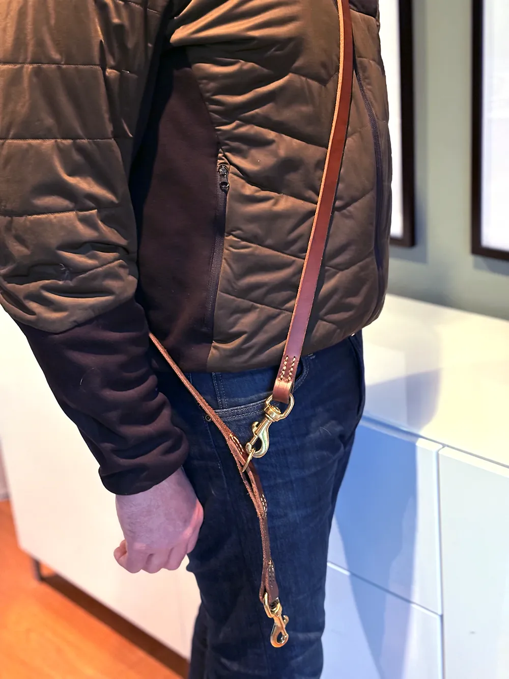 Handsytt ”Tyskt” läderkoppel i 18 mm bredd med karbinhake i gjuten mässing. Används för att kunna ha båda händerna fria vid t ex jakt.