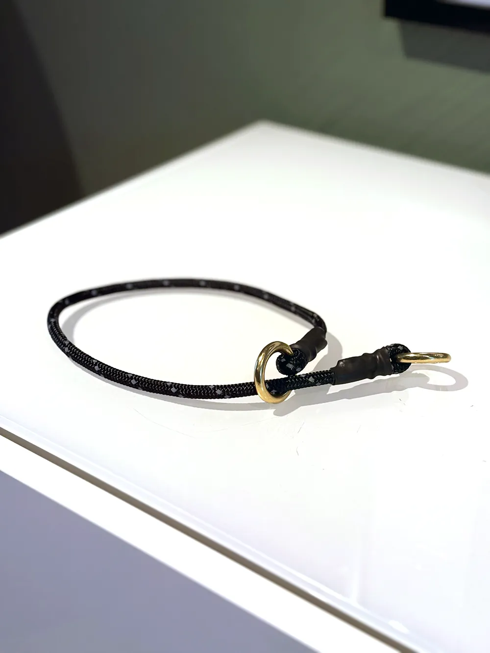 Handgjort dressyrhalsband av Polypropylen samt kraftiga O-ringar av gjuten mässing med insydd reflex i halsbandet.