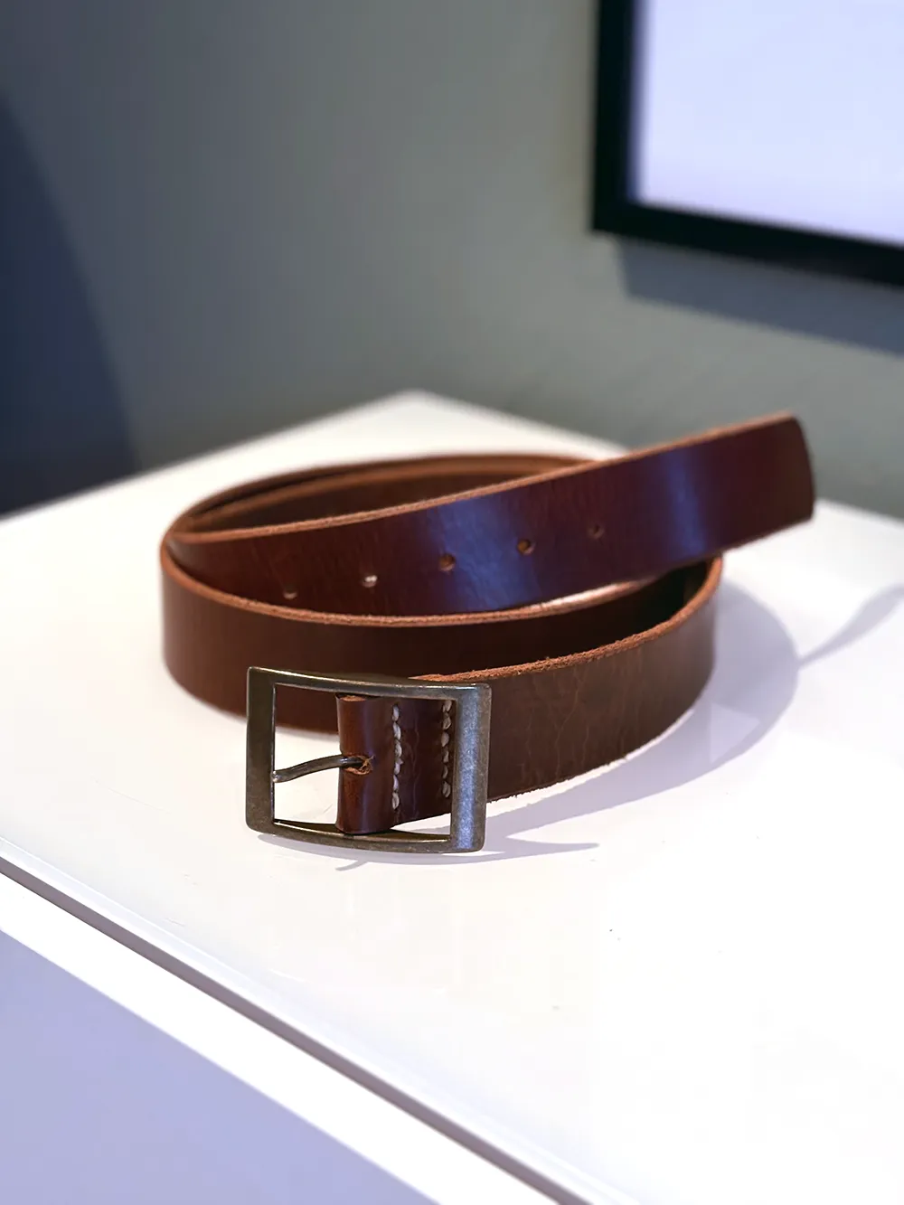Handsytt läderbälte i 43 mm bredd med spänne i gjuten antik mässing.
